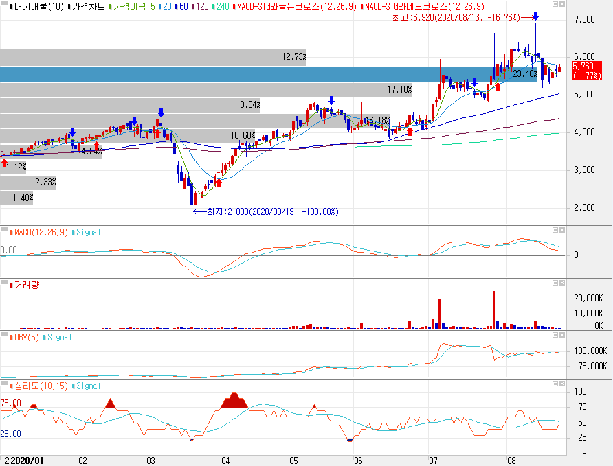 주가는 안정적으로 우상향 중입니다. 3월 코로나로 인한 폭락시 최저점 2,000원을 찍고 반등하여 현재 5,760원으로 마감했습니다. 최근 잠시의 조정이 있었지만, 5,300원대의 지지선을 밟고 반등하는 모양새입니다. OBV 지표도 꾸준히 매집이 이루어 지고 있으며, 심리도도 50정도로 적당합니다.