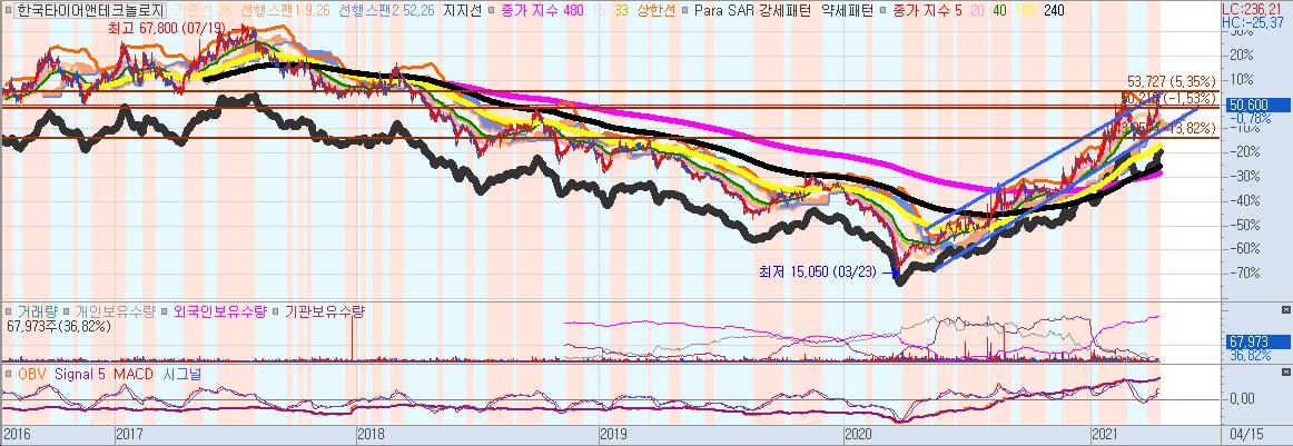 21/2/22일 54,000원 고점을 찍은후 1차 파동이 끝나고 눌렸다가 2차 파동의 초입으로 볼 수 있을 것 같은데요, 글을 쓰는 현시점(21/4/15)에 단기 쌍봉찍고 눌릴지 2차파동으로 쭉 이어갈지 봐가면서 대응해야 할 것같습니다.