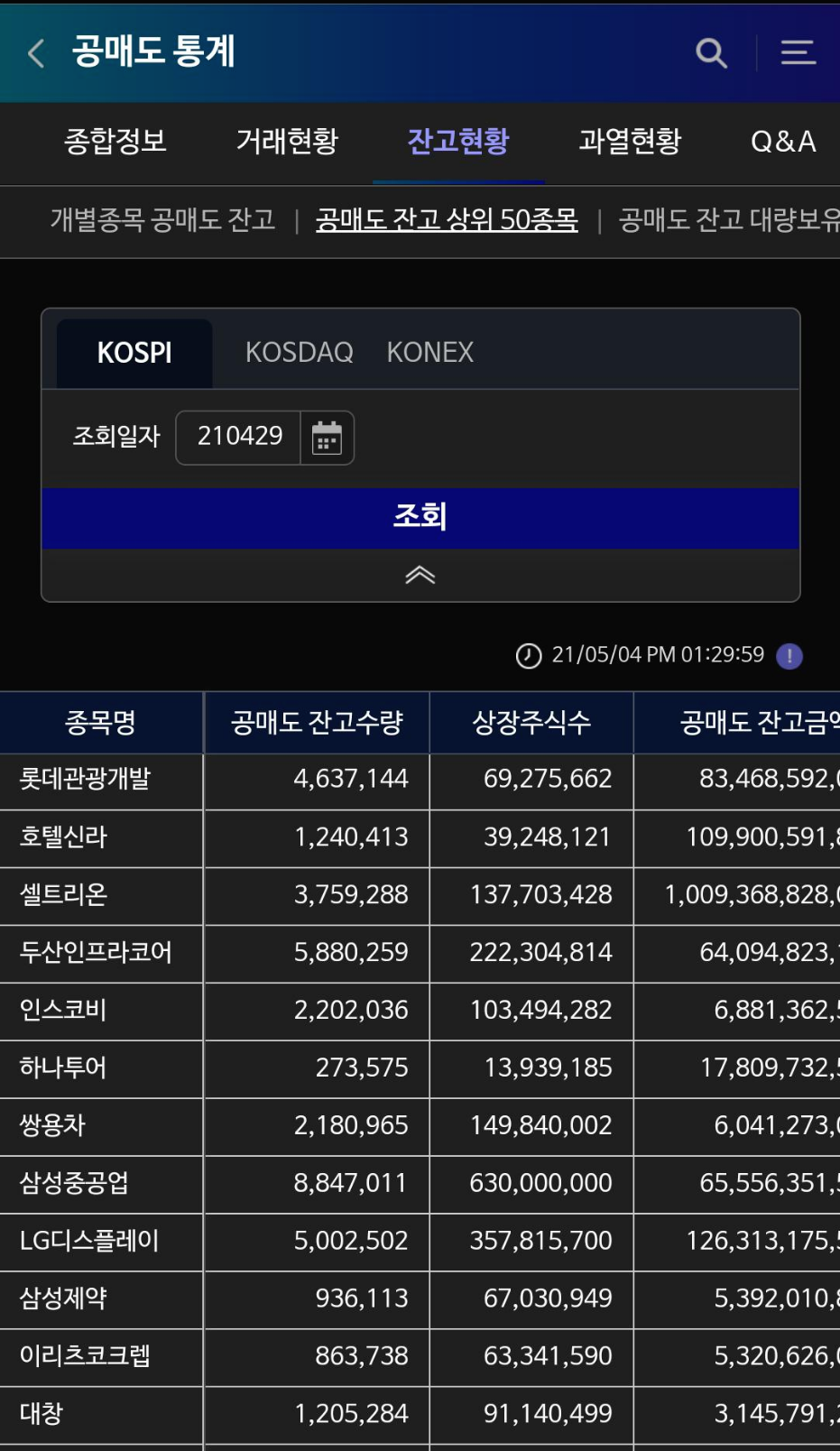 2. 개별종목 공매도잔고 또는 공매도 잔고 상위 50종목, 공매도 잔고 대량보유종목 등 원하는 메뉴선택 후 확인