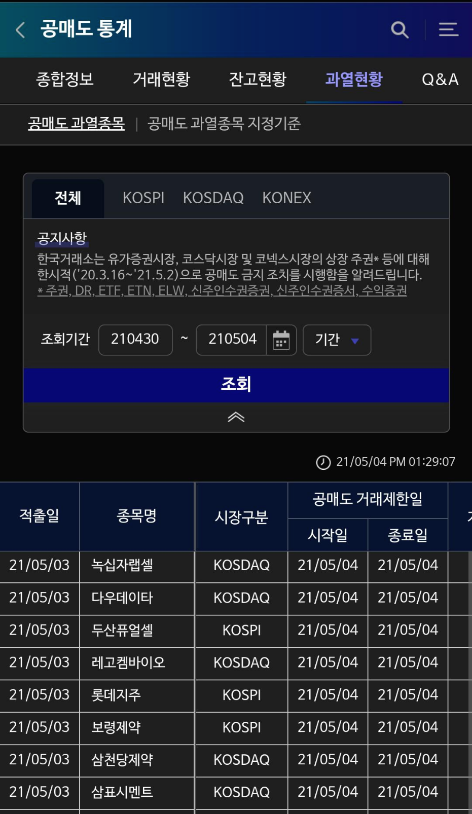 2. 좌측 메뉴의 공매도과열 → 공매도 과열종목 선택 후 오른쪽 화면에서 종목확인