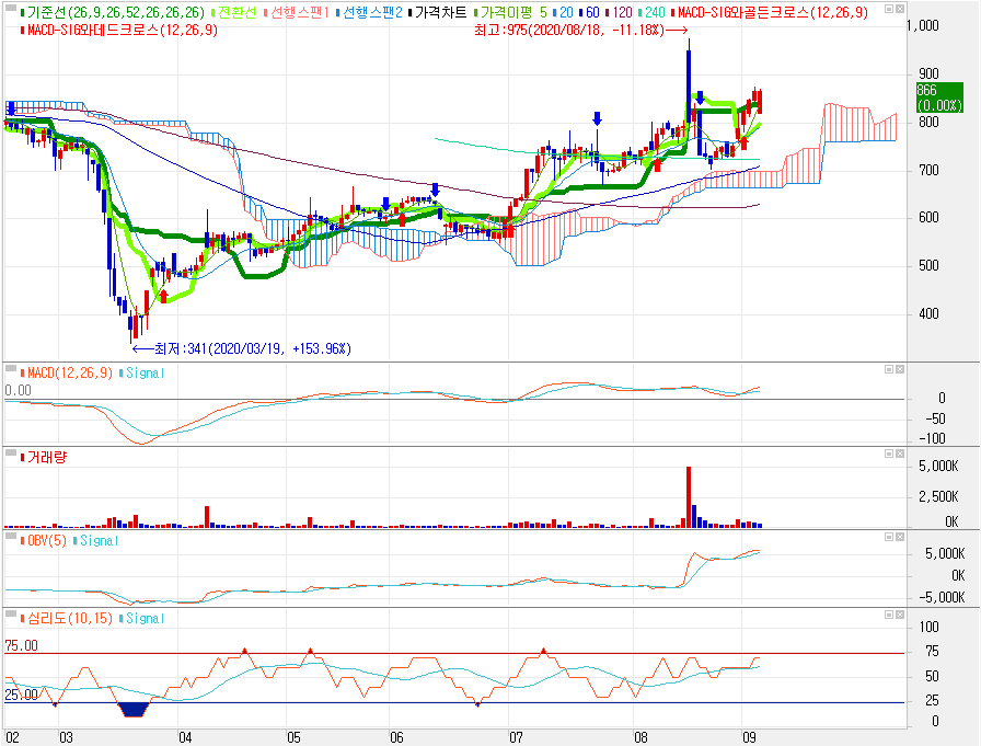 앞으로 강한 거래량이 유입되면서 전고점인 975원을 뚫는다면 동전주를 벗어날 수 있다고 생각됩니다. 그러나 동전주는 언제든 아래로 찍어누를수 있으므로, 지표추세가 꺾이거나, 손절선인 760원으로 잡고 대응하려고 합니다.