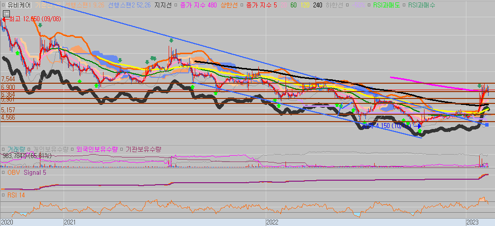 인피니트헬스케어는 의료영상 저장, 전송분야 1위 기업입니다. 시장 분위기가 전반적으로 좋지 않았던 2022년 하반기에 주가를 계속 상승시켜 온 강한 종목입니다. 하락추세를 뚫고 올라와 물량 소화를 하고 강하게 480일선까지 뚫고 올라왔습니다. 이런종목이 강한 시세를 뿜어주는 법이죠. 480일선이 강하게 주가를 지지하는 모습을 보일때 도전해 볼 만한 종목입니다.