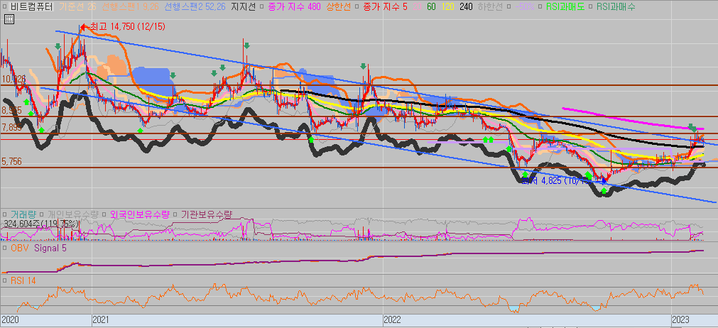 작년 하반기에 하락추세의 상단을 뚫었다가 주저 앉았었는데, 다시 한번 추세 상단을 뚫고 올라왔네요. 재료도 있고, OBV상 매집도 어느정도 이루어진것으로 보입니다. 장기이평선을 밟고 다시 올라갈지 기대가 됩니다.