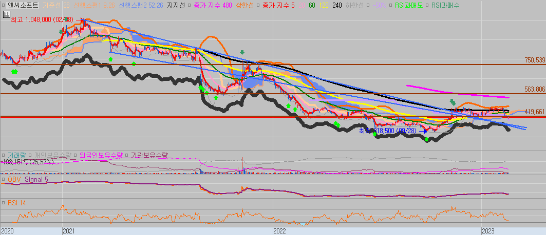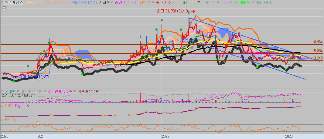 "넥슨게임즈"의 중장기이평선은 수렴의 모습을 보이고 있고, 주가도 일목구름대 위에 있는 모습입니다. 그러나 추세상 하락추세 상단에 막혀있는 모습이므로, 추세를 뚫고 안착하는 모습을 보일때 들어가는 것이 안전할 것 같습니다.