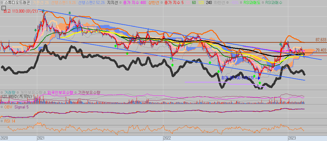 "카카오게임즈"는 <오딘>과 <우마무스메>를 퍼블리싱하고 재미를 봤었던 종목입니다. 헤드앤숄더 패턴을 보이고 주루룩 흘러왔었는데, 요새 이평선 각도가 수평으로 가면서 6개월선에 안착한 모습입니다. 주가도 일목구름대 위로 올라왔구요.