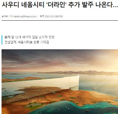 사우디아라비아가 네옴시티 핵심 프로젝트 가운데 하나인 '더라인(The Line)'의 추가 공사 발주에 나섰습니다. 지난해 네옴시티 뉴스가 언론을 도배하면서 네옴시티 관련주들이 핫한 움직임을 보여줬었는데요, 그 후 잠잠하던 네옴시티가 다시금 추가 발주 뉴스가 뜨면서 이미 해당 사업에 참여하고 있는 삼성물산과 현대건설을 비롯해 사업설명회에 참가했던 대우건설 등 건설사주가 주목을 받고 있습니다.