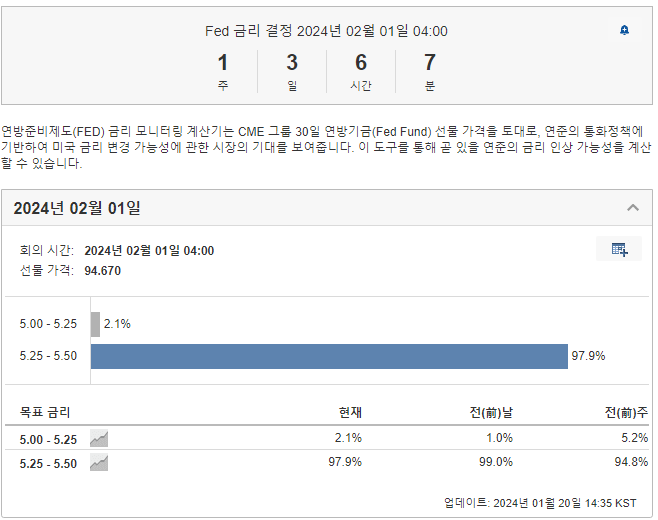 오는 2월1일 FOMC 회의에서 금리동결은 거의 확정적이라고 진작부터 예상되었었는데요, 3월 금리인하 기대감이 1주일 전만해도 80%가 넘었는데 각 경제지표에 연준 인사들의 발언을 보면서 기대를 접은 것 같습니다. 이제는 동결 확률이 52.9%로 훅 올라왔네요..