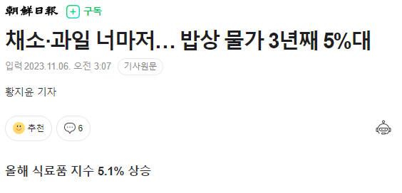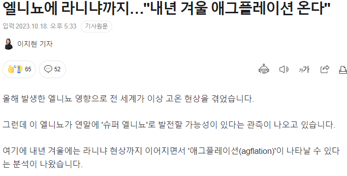 우리나라 밥상 물가는 줄곧 5%이상 상승하고 있고, 개별 작물로 봐서는 상승률이 더 높기때문에 이상기온이 더욱 심화되어 피해를 준다면, 애그플레이션(Agflation) 위기 또한 올 수 있고, 전문가들도 계속 경고하고 있습니다.