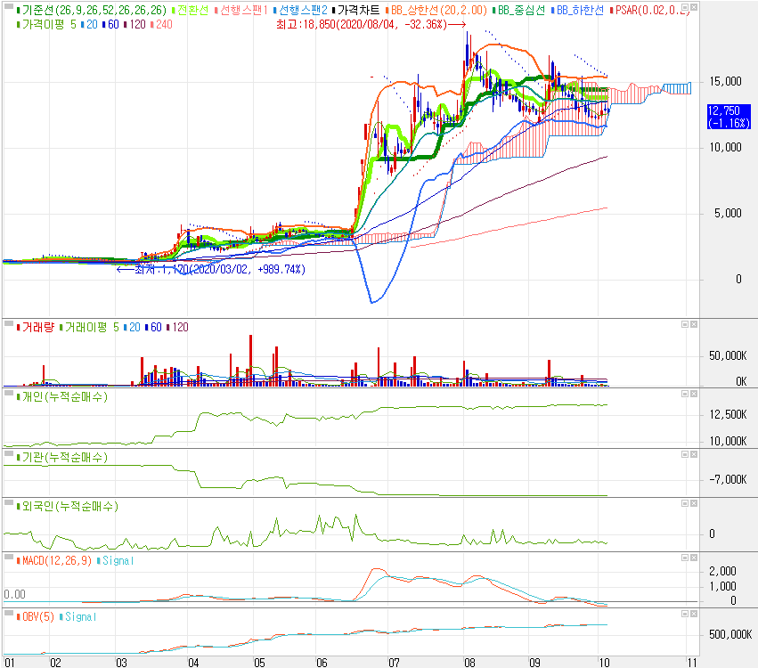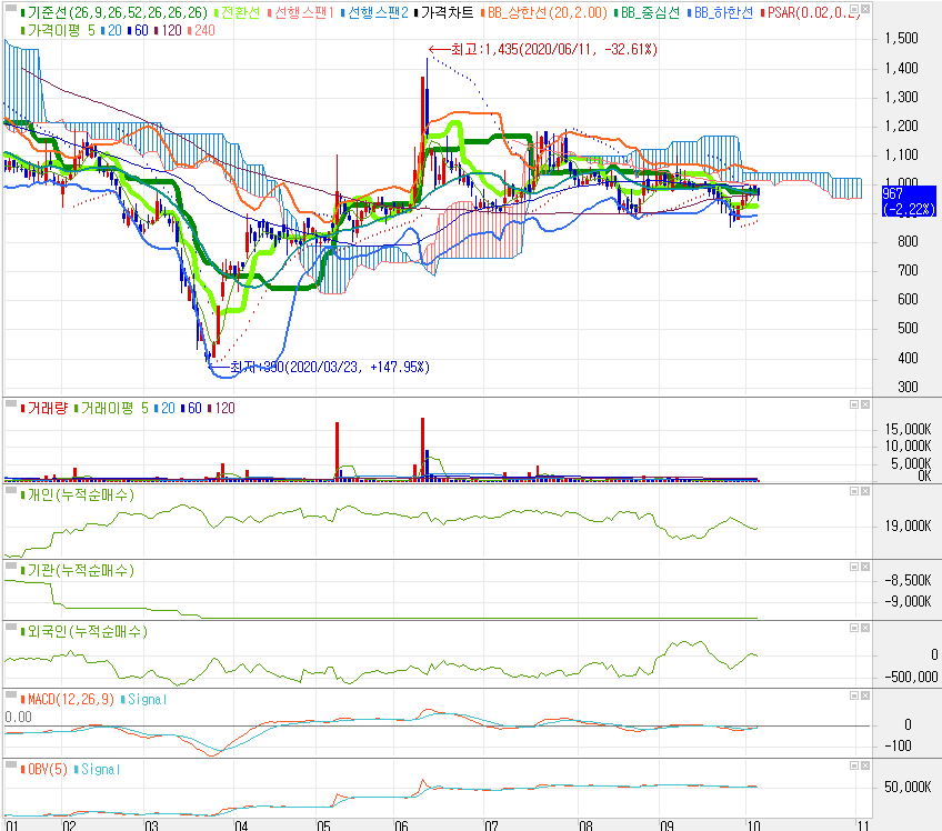 주가는 계단식 상승후 하락세에 들어섰습니다. 현재 매물구름대안에 갇혀있는데 지지를 해줄지 아래로 뚫릴지 지켜봐야 하겠습니다.