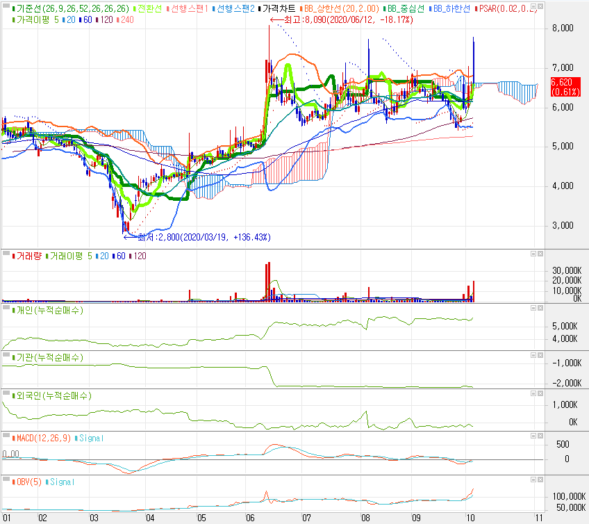 이런저런 테마를 많이 타기때문에 주가 변동이 심한편입니다. 주가 방향성을 가늠하기 힘든종목인데 5,000원 부근대로 지지층이 이루어져 있어서 하락세에 1차매수가로 잡는것도 좋아보입니다.