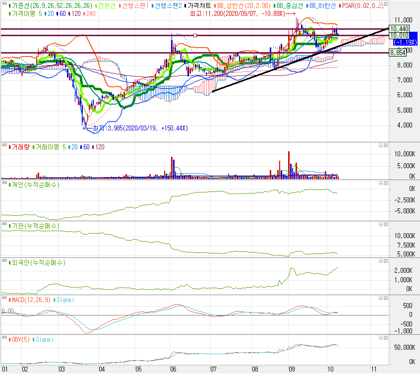 주가는 호재와 실적을 반영하듯 꾸준한 우상향 중입니다. 외국인들이 꾸준히 매집중이며, 최근 잠시 하향에도 세력의 매집하는 모습이 보이고 있습니다. 일봉이 기준선을 타고 있고 전환선도 기준선 아래로 내려와있는걸 보면 단기적으로 고점 수준으로 보이는데, 아직 상향할 가능성이 남아있다고 생각됩니다. 8,850원아래로 내려가게 되면 확실히 하향추세로 전환되어 아래로 7천원대까지 열려있기때문에 손절라인으로 잡고, 거래량과 함께 전고점인 11,200원을 뚫는 지 지켜봐야겠습니다.