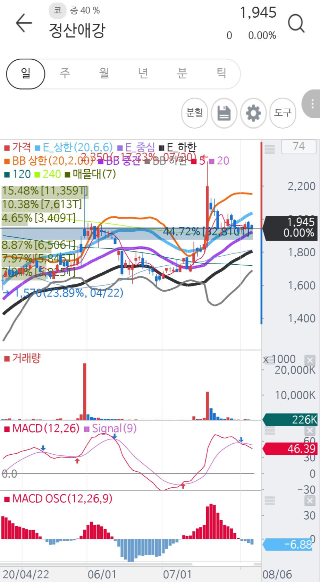 7월에 들어서면서 상향추세로 전환되었는데, 이는 원자재 가격 상승에 힘입은 주가상승아닐까 싶습니다. 금과 은뿐아니라 원자재 가격 상승이 계속 되고 있으므로 흐름이 기대됩니다.