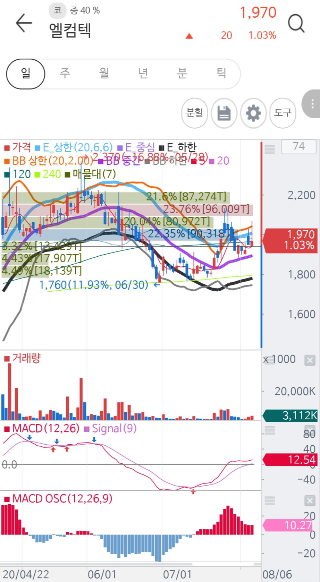 최근 주가가 하향추세에서 엔벨로프 하단 및 볼린저밴드 하단을 뚫고 내려갔다가 금값 상승과 함께 좋은 흐름을 보여주었습니다. 그러나 금값의 고공행진 대비해 대장주라는 종목의 주가 움직임은 지지부진 하고 있습니다.