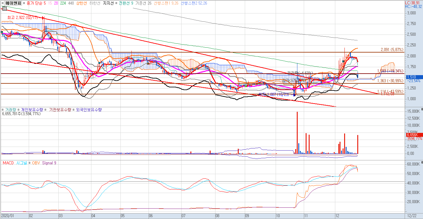 에이엔피의 재무제표를 보면 4년간 매출액은 크게 떨어지지 않았으나 영업이익이 적자를 지속 중입니다. 주가를 부양할 수 있는 모멘텀이 없는 와중에 하락추세를 벗어나려는 움직임을 보였네요. 단순한 개미들의 매수세때문일지, 세력이 입성한건지는 앞으로 추세를 보면 알수있겠죠.