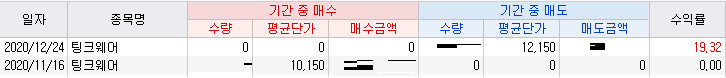 ★ 팅크웨어(084730)★ ◎ 매수일 : 2020.11.16 ◎ 매수가 : 10,150원 - PER : 18.36(2019년) - PBR : 0.45(2019년) - BPS : 15,768원(2019년) - ROE : 2.76%(2019년) - EPS : 389(2019년) - EV/EBITDA : 3.6%(20..