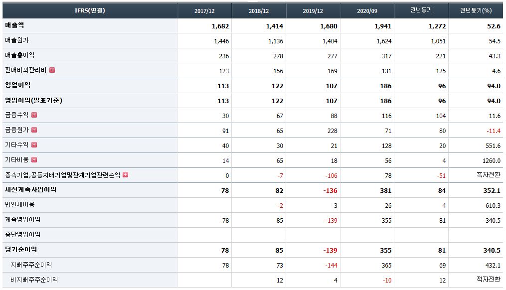 2020년 9월 전년동기 대비 연결기준 매출액은 52.6% 증가, 영업이익은 94% 증가, 당기순이익은 432.1% 증가하였습니다. 휴대폰용 터치스크린모듈의 판매량이 증가하고 금융수입, 진단키트 등의 사업이 새로 편입되며 매출액이 크게 증가하였고, 자산 처분으로 수익성이 매우 개선되었습니다. 2020년 이후 선진시장 중심으로 5G교체수요 발생 및 (주)다이노나의 혈장분리기술로 인한 매출 등의 성장이 기대됩니다.