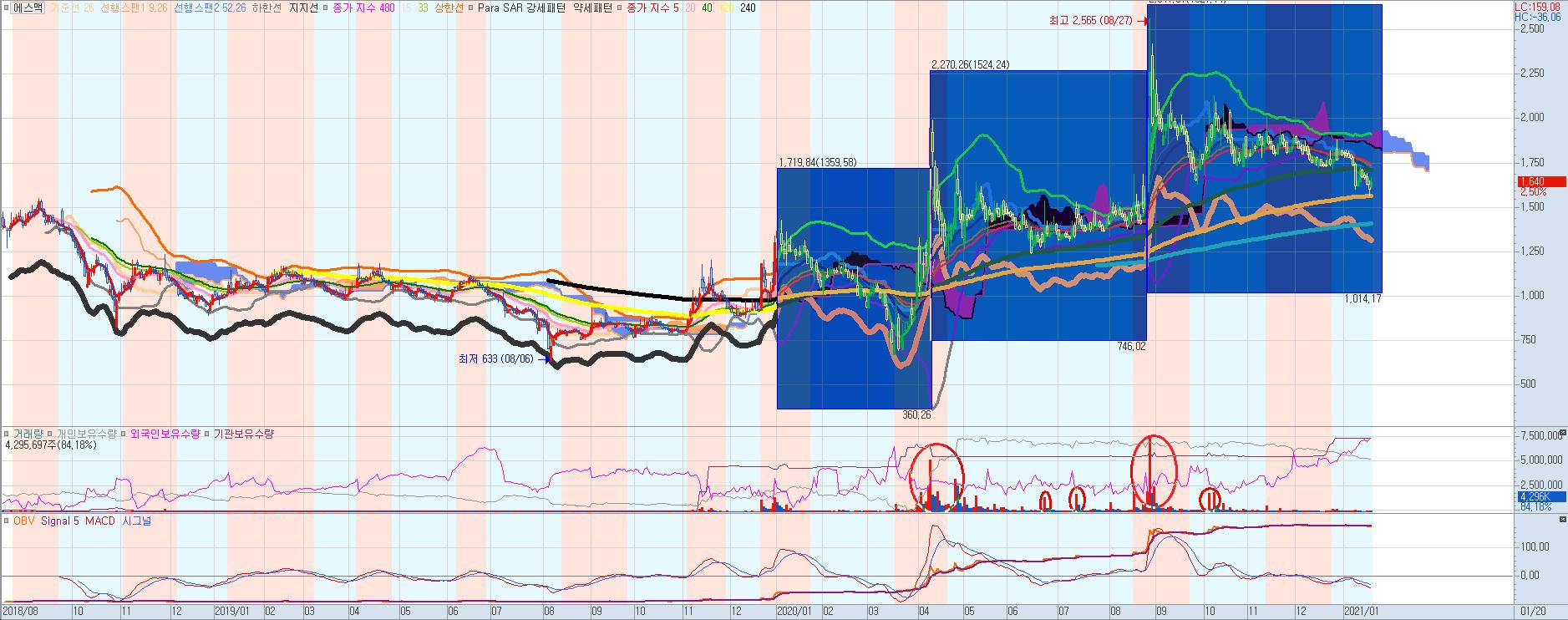 에스맥의 차트를 보면 최근 같은 패턴을 반복하며 주가를 올리고 있습니다. 2019년까지는 슬금슬금 내려오는 하락추세에 매물을 야금야금 소화하더니, 급등 후 눌리거나 급등 후 횡보하는 모습입니다. 최근 주가가 횡보하다 골을 파고 있는데, 골을 어디까지 파고 회복할지, 긴 하락구간으로 돌입하는건지 매의눈으로 지켜봐야하겠네요...